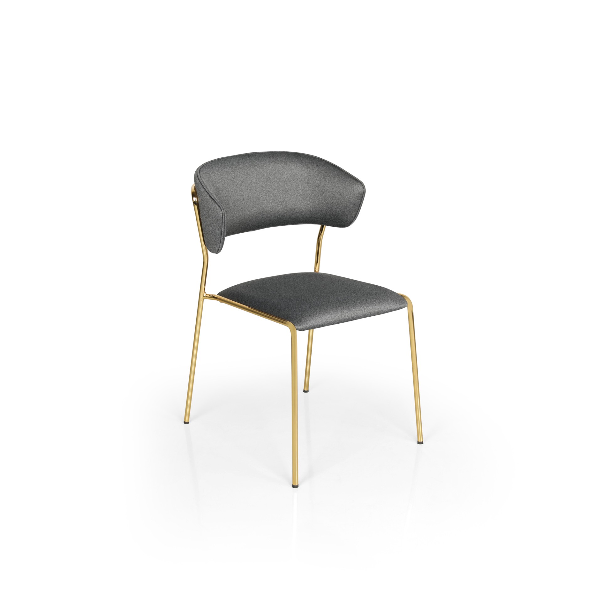 Oturum ve sırt bölümünde kullanılan yumuşak döşeme, uzun süreli oturumlarda konforu desteklerken; minimal sırt formu kullanıcıyı doğal şekilde kavrayarak ergonomiyi artırır. Altın tonlu metal ayakları modelin lüks duruşunu güçlendirir ve dekorasyonlarda göz alıcı bir detay olarak öne çıkar.