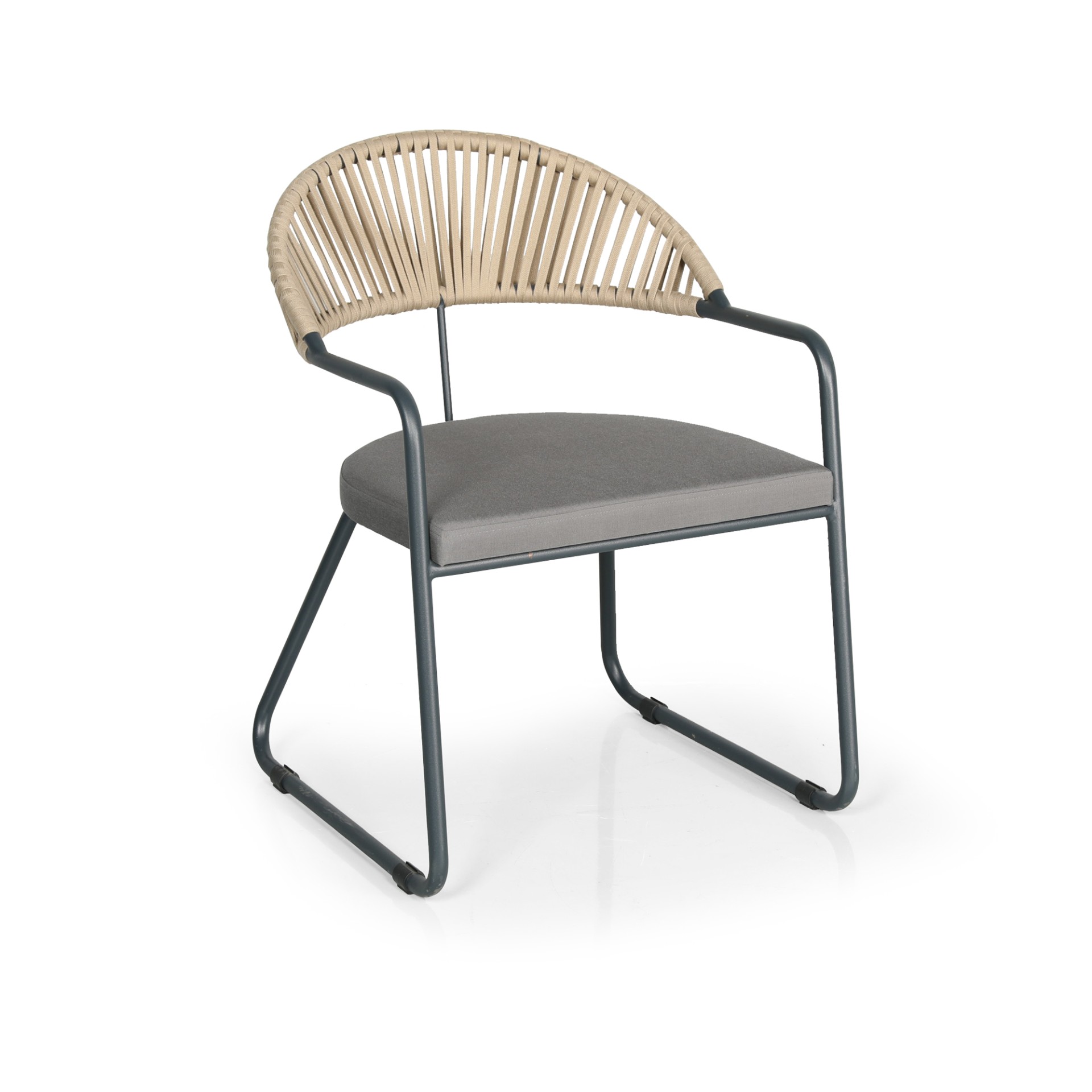 Bobo Dış Mekan Sandalyesi, yarım daire kavisli örgü sırt formu ve modern metal gövdesiyle dış mekânlara hem doğal hem de çağdaş bir estetik kazandırır. El işçiliğini andıran örgü sırt yapısı oturumu saran bir konfor sunarken, modelin karakteristik görünümünü de güçlendirir.
